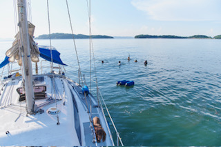 静かな入り江でアンカーを下ろし、ヨットを海の上の拠点に。
